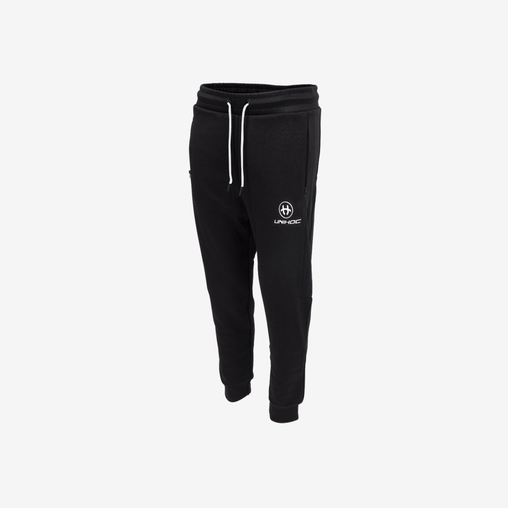 Tepláky Unihoc Technic mají užší střih, dvě postranní kapsy na zip a gumu v pase. Malý potisk na levé nohavici.